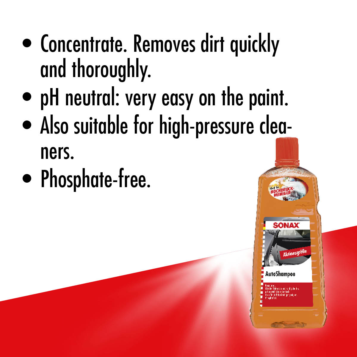 Concentrated cleaning power for the manual vehicle wash. Phosphate-free and PH neutral