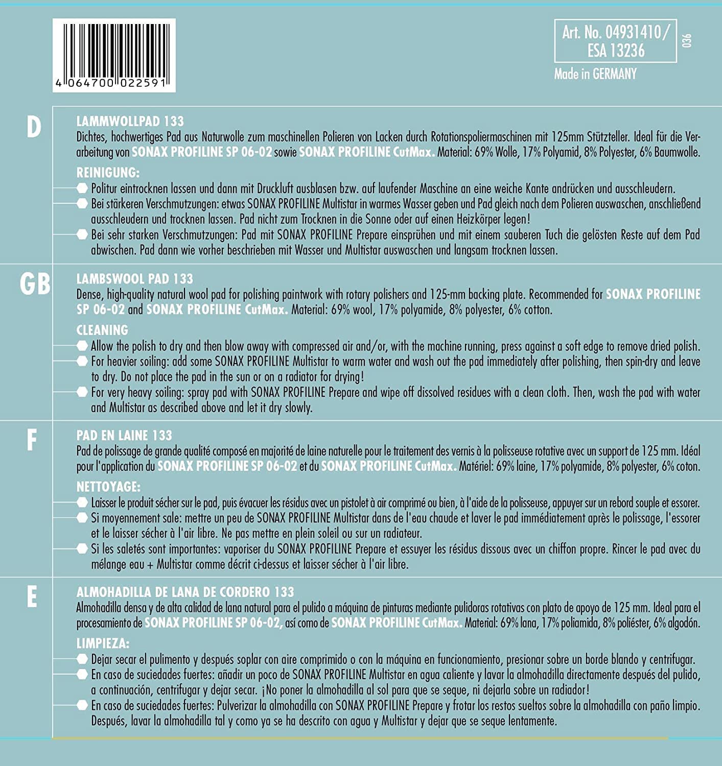 Thick, high quality fur to be used in conjunction with abrasive polishes and pastes from the SONAX Profiline line. For maximum abrasiveness with a very long service life.