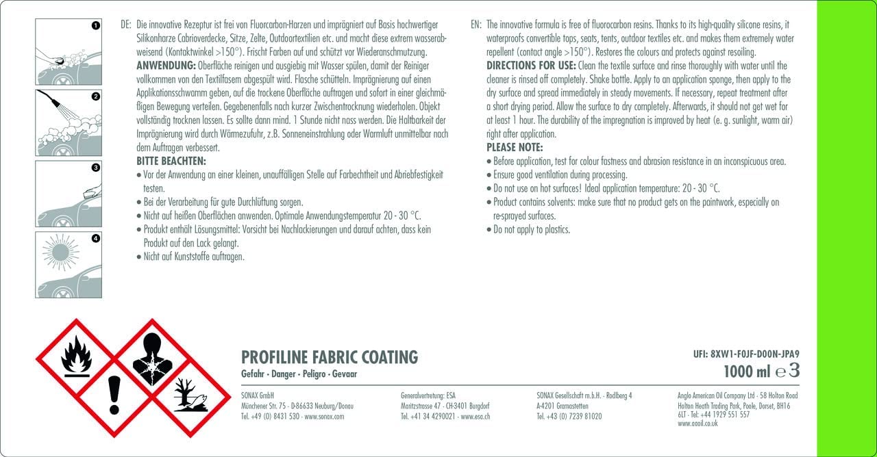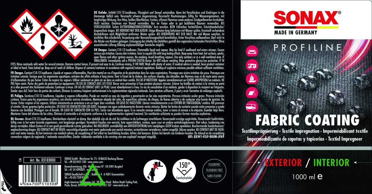 Textile impregnator for the exterior and interior. Free from fluorocarbon resins. Extremely water-repellent (contact angle >150°). Refreshes colors and protects against re-soiling.