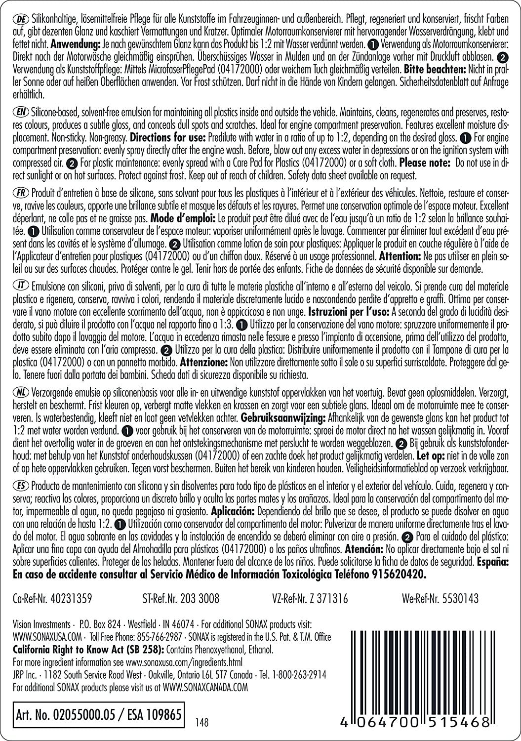Freshens up colours, provides a decent shine, removes dull spots and scratches. Conserves all plastics including engine bay