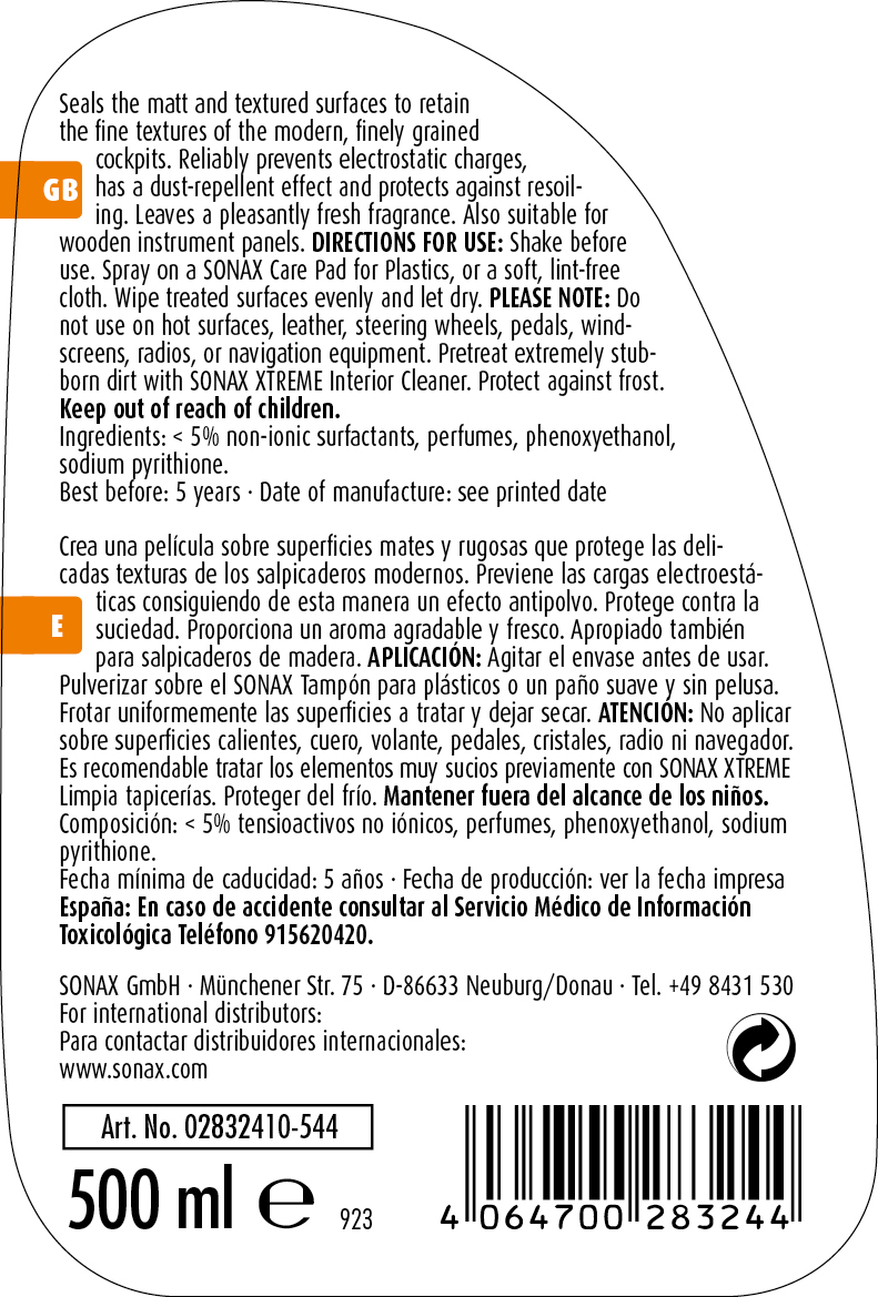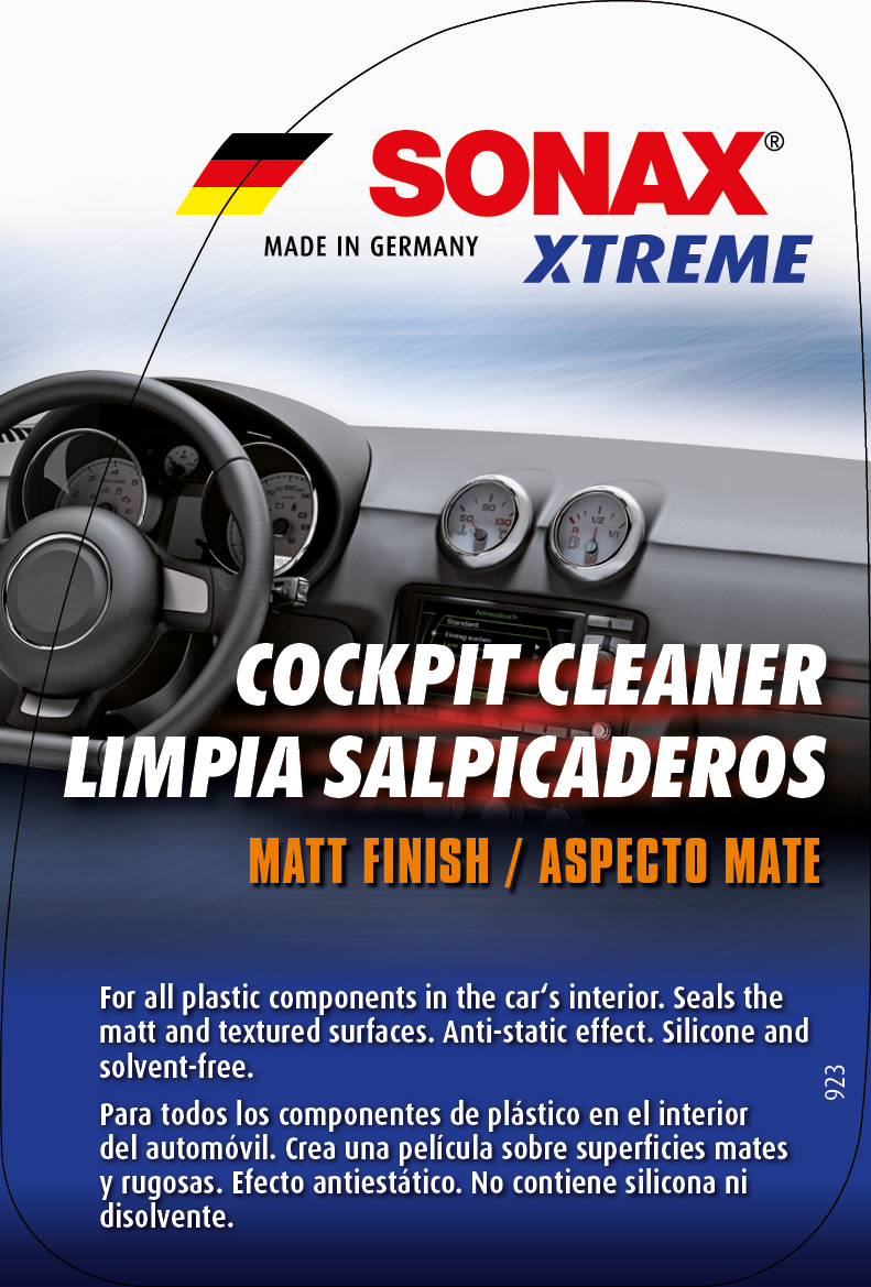 Cleans, maintains all interior plastic car parts. Prevents electrostatic charging. Renews matt and grained cockpit surfaces.